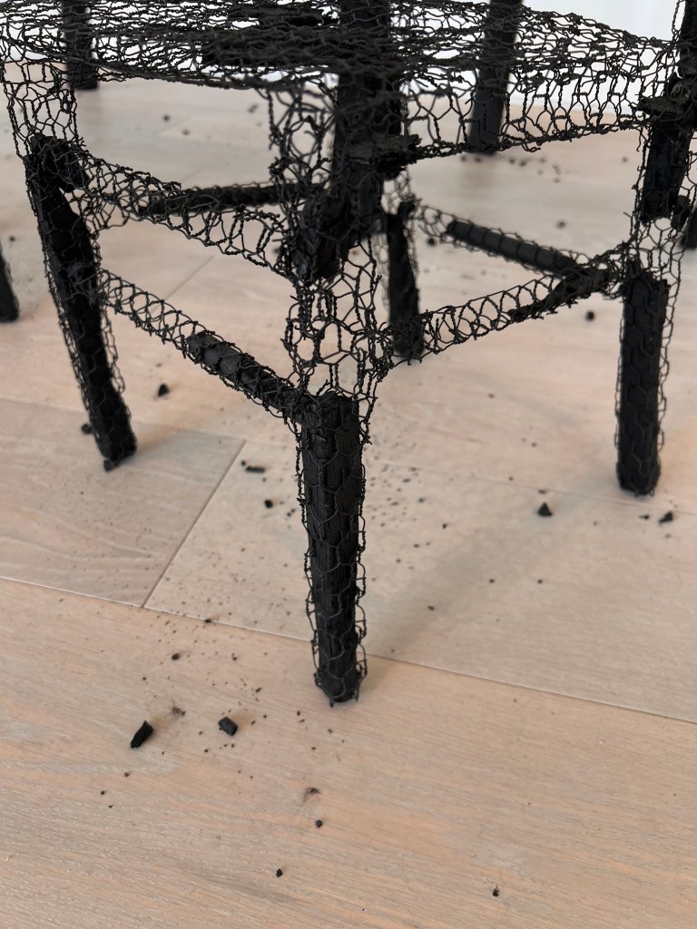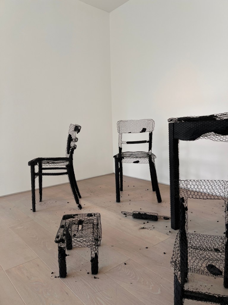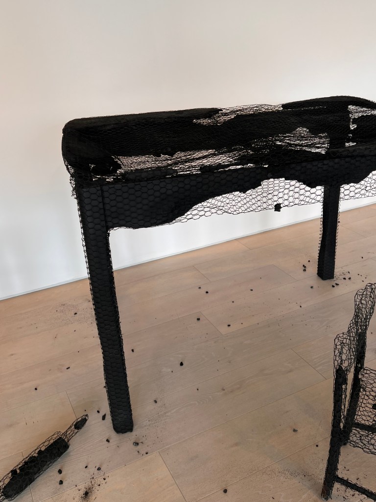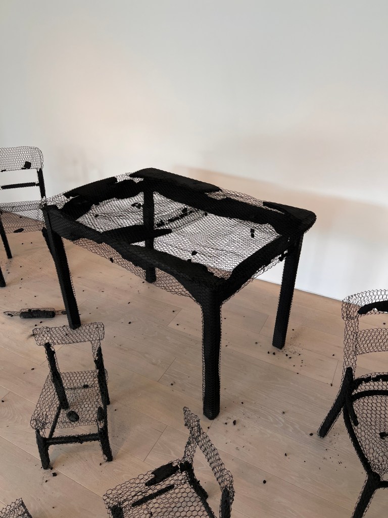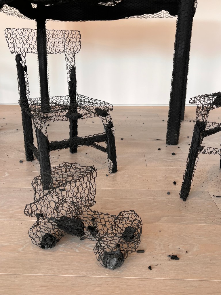 This installation looks like the ruins of a home that has been suddenly destroyed. The wooden furniture is burned and fragile, barely held together with wire mesh, as if it could fall apart at any moment. The scene feels like walking into the remains of a bombing – tables, chairs, and toys left behind in pieces.