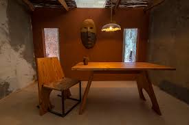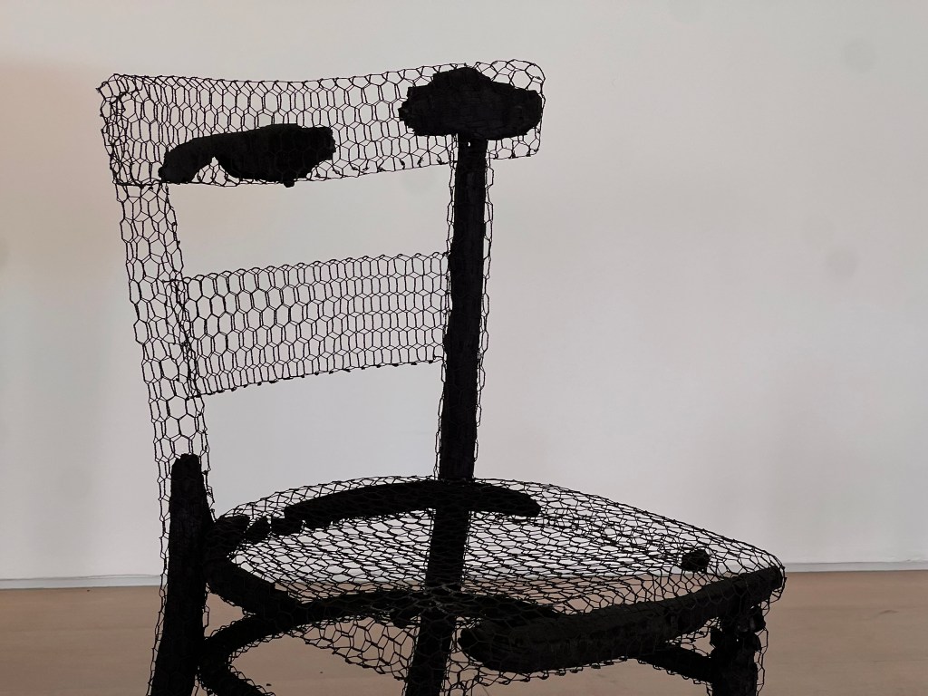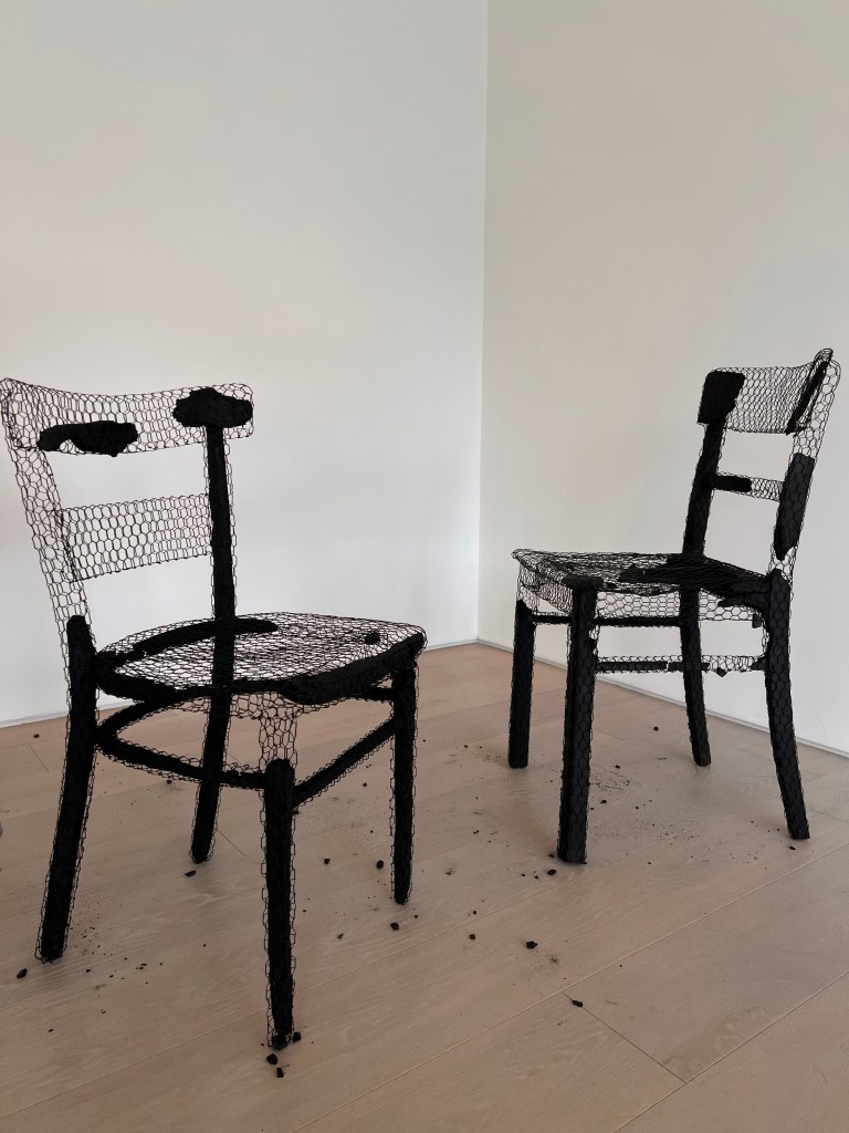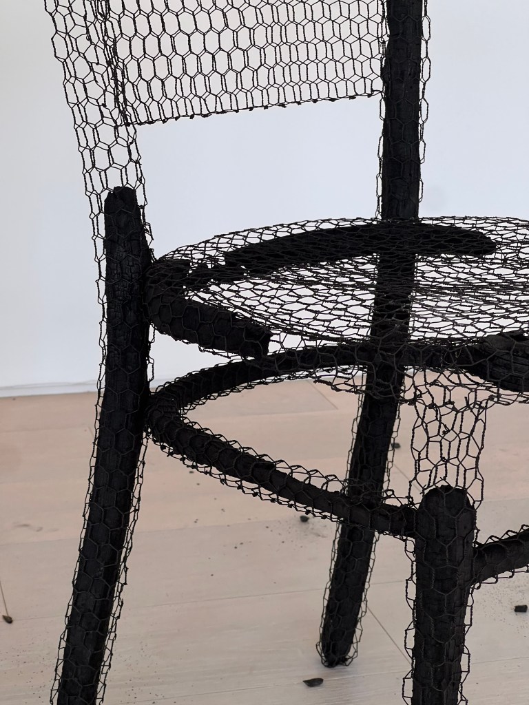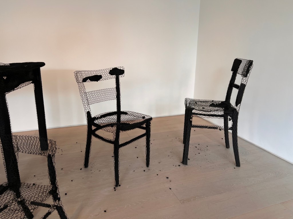 This installation looks like the ruins of a home that has been suddenly destroyed. The wooden furniture is burned and fragile, barely held together with wire mesh, as if it could fall apart at any moment. The scene feels like walking into the remains of a bombing – tables, chairs, and toys left behind in pieces.