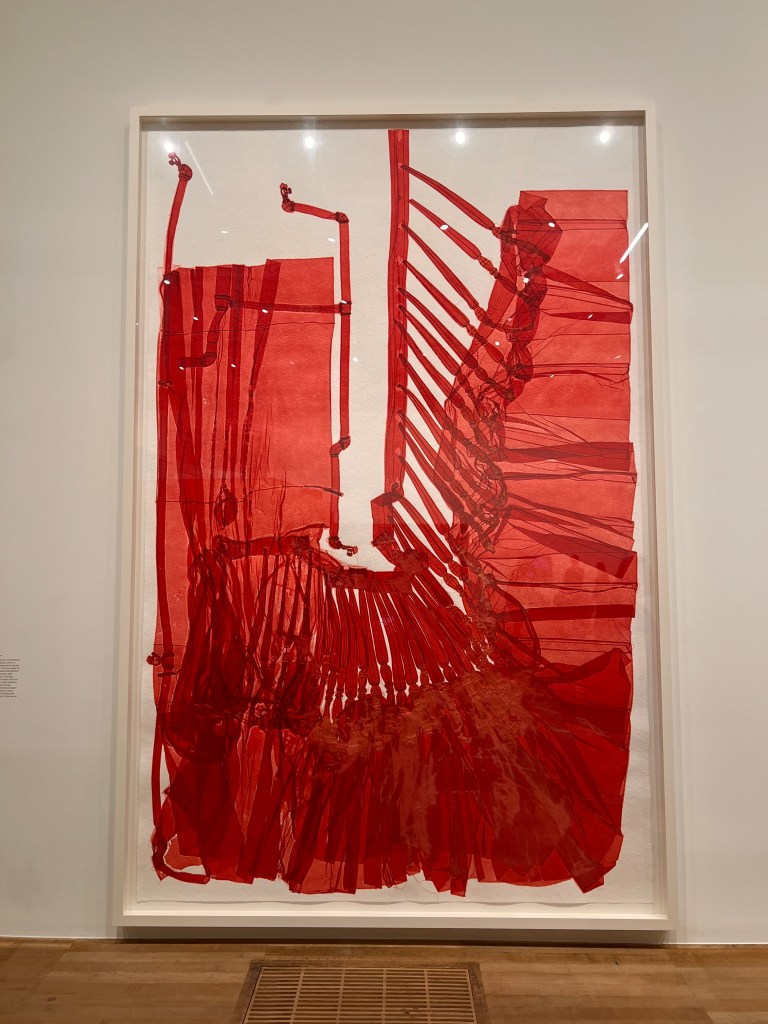 This hand-drawn map of Beirut on translucent tracing paper shows burnt-out rectangles marking the destruction caused by the 2020 port explosion. The fragility of the paper and the delicate, lace-like patterns highlight both loss and violence. While the map depicts Beirut, it also evokes larger ideas about war and destruction happening across the world today. When I look at it, I think about Palestine and Gaza, where genocide and constant bombing are normalised and constantly being justified. The map’s absences reflect not only physical destruction but also the ways governments and systems erase or hide violence, leaving people to suffer silently. Hatoum’s work reminds us that these are not natural disasters or accidents – they are caused by humans, and the indifference or silence of the world amplifies the injustice. Through its delicate surface, Beirut (major) speaks about fragility, loss, and the impossibility of ignoring the pain and destruction that continue across the globe.