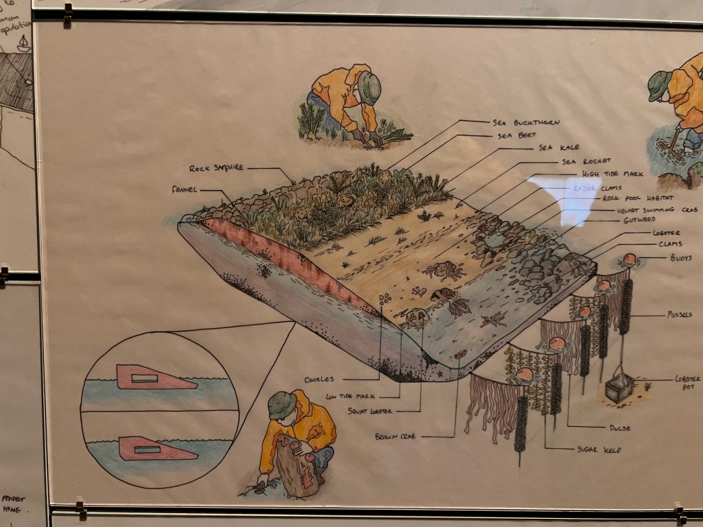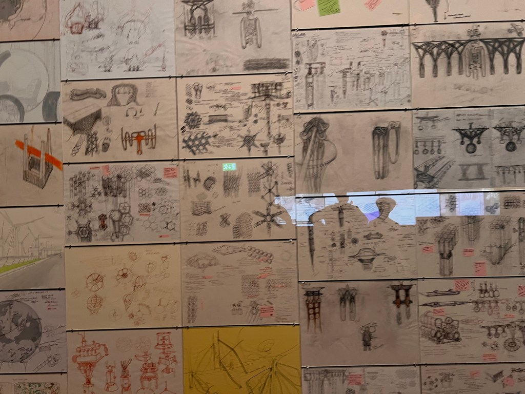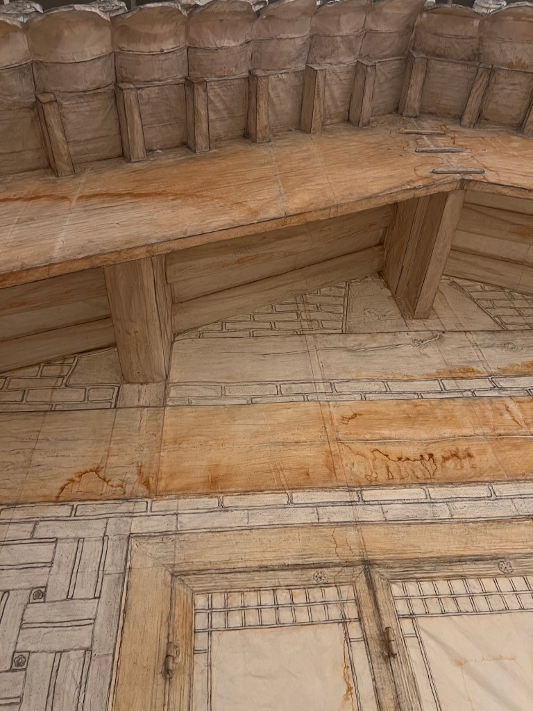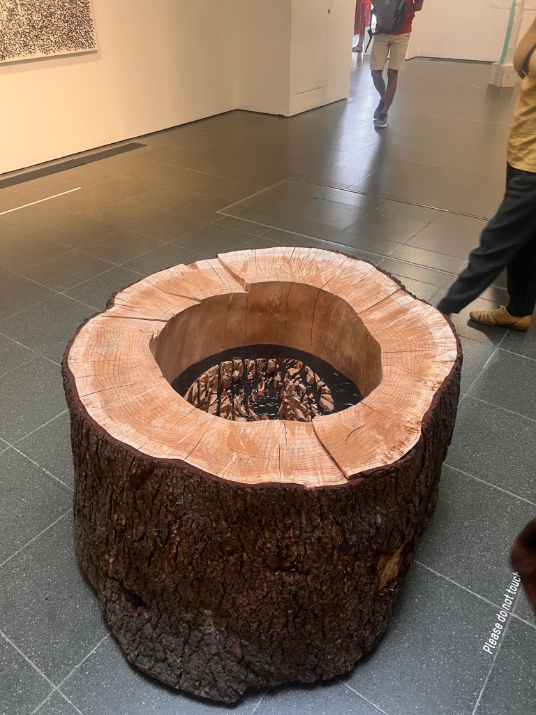 As I entered the exhibition, the first thing I noticed was a half-cut cedar trunk, and the fragrance of the wood was immediately noticeable. Moving into the next room, there were twelve pieces of bark, cut and arranged together on a wooden structure. Each piece was beautifully carved, and the walls around them were covered with leaves, stacked inside metal mesh shells with holes. The combination of texture, smell, and scale made it feel spectacular.