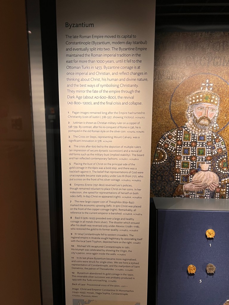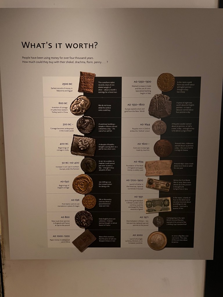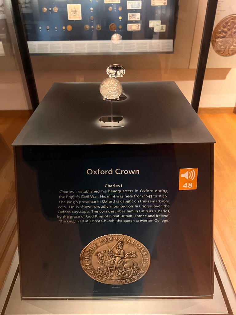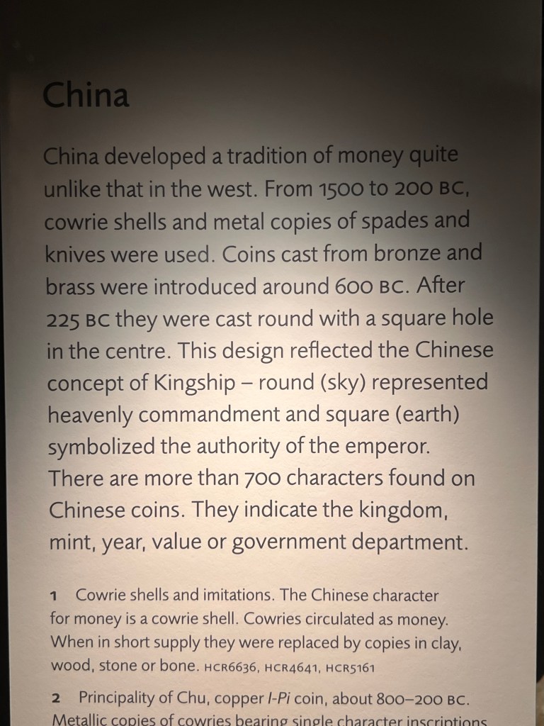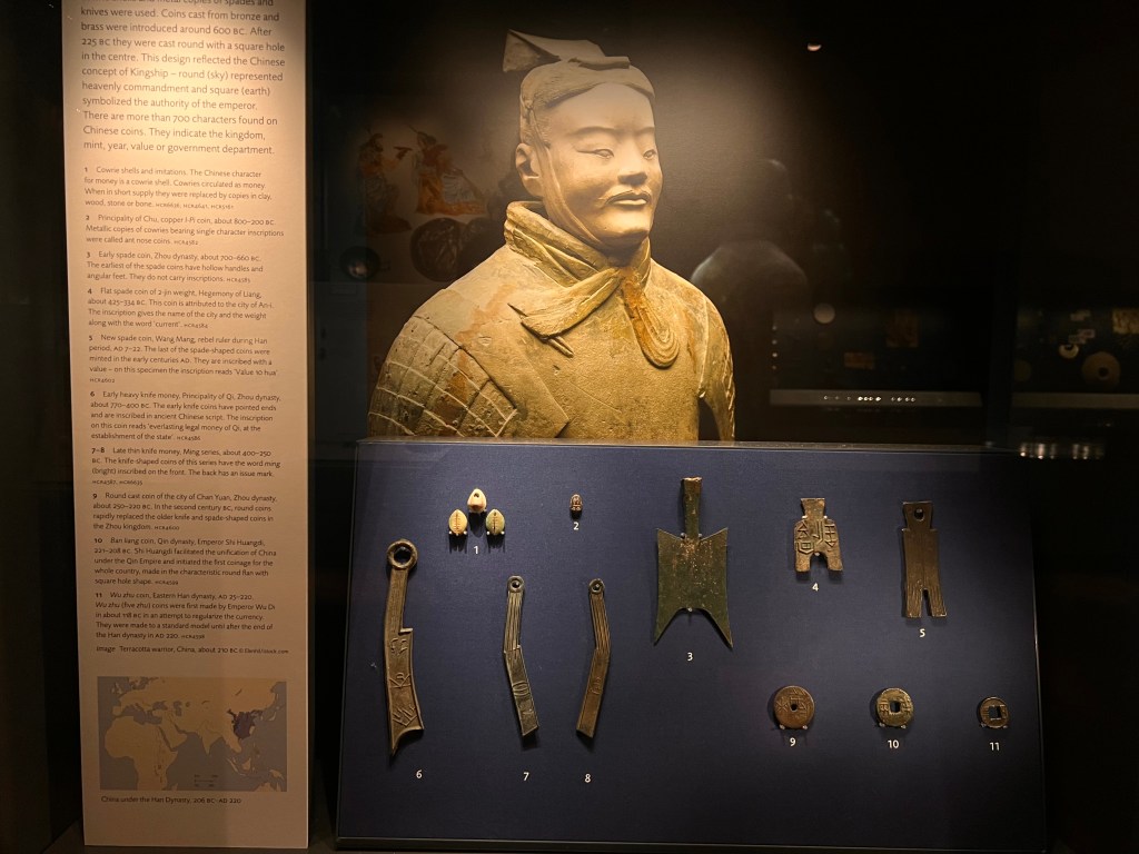 In the coins section at the Ashmolean Museum, I was drawn to the history of money and how it reflects power. It was fascinating to see how things that were important in daily life became forms of money from cowrie shells and metal copies of spades and knives in China between 1500 and 300 BC, to bronze and brass coins around 600 BC. After 225 BC, Chinese coins were round with a square hole in the center, symbolizing kingship: the round shape for the sky, the square for the emperor’s authority.