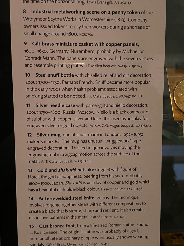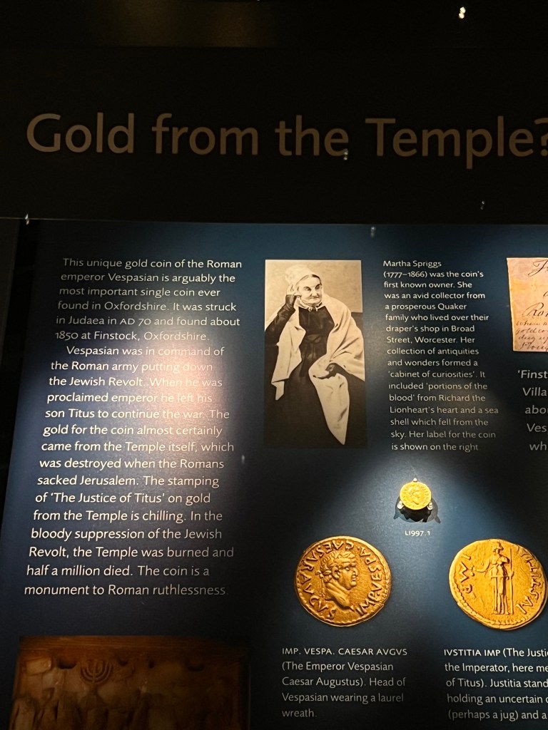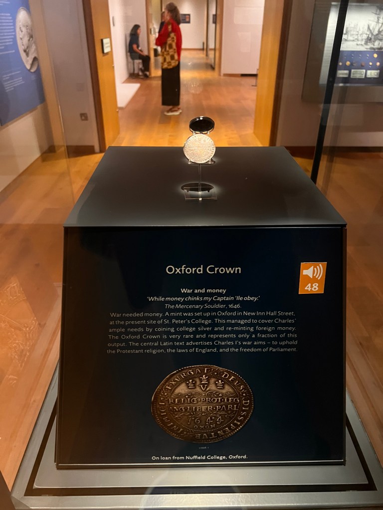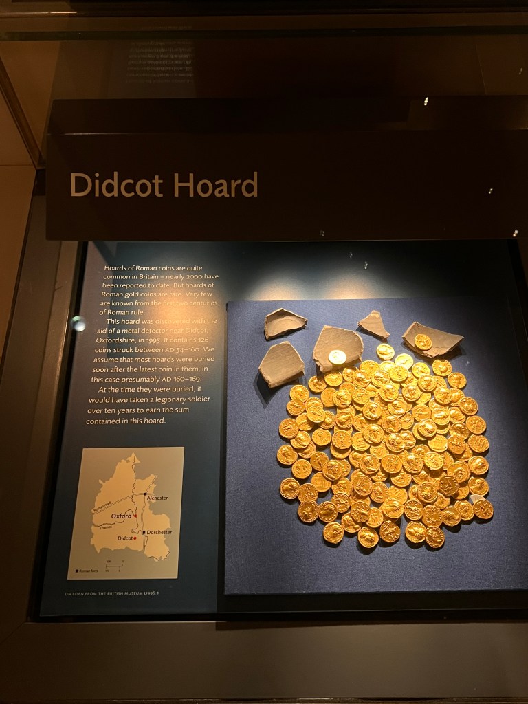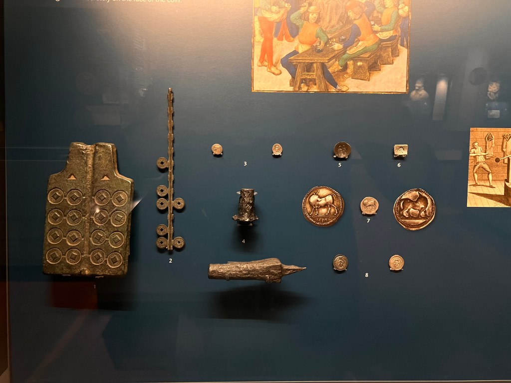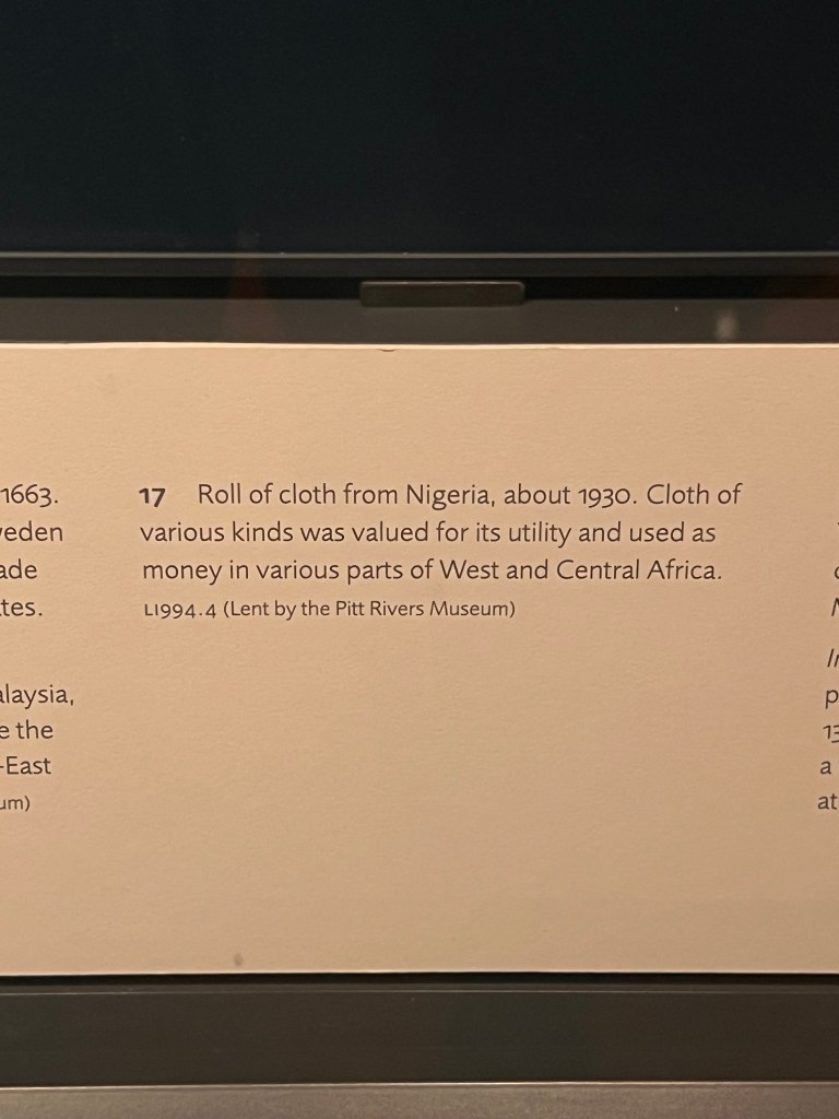 In the coins section at the Ashmolean Museum, I was drawn to the history of money and how it reflects power. It was fascinating to see how things that were important in daily life became forms of money from cowrie shells and metal copies of spades and knives in China between 1500 and 300 BC, to bronze and brass coins around 600 BC. After 225 BC, Chinese coins were round with a square hole in the center, symbolizing kingship: the round shape for the sky, the square for the emperor’s authority.