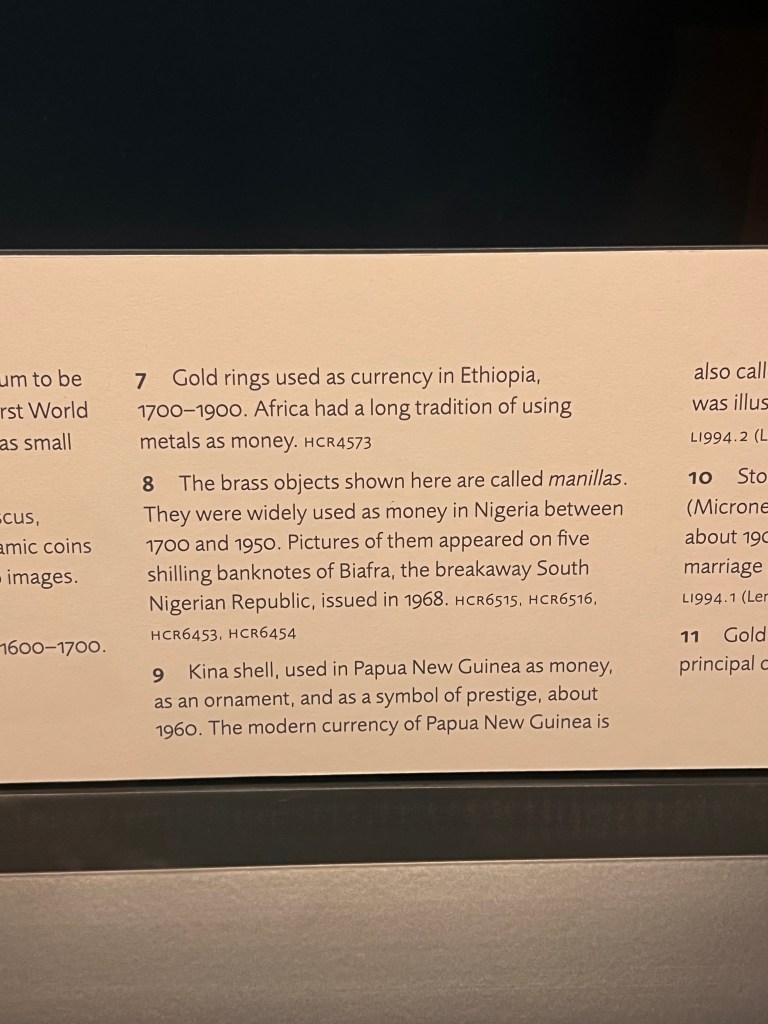 Other examples from around the world were equally interesting: cowrie shells in Papua New Guinea, and brass objects called manilas in Nigeria. Back then, money was literally tied to what people valued and used most in life. Today, currency has evolved into a system where we buy more and more, sometimes of the same things, and money drives people to fight, creates poverty, and defines survival. Rent keeps rising, and people’s value is measured by wealth – very different from when money represented essential things.
