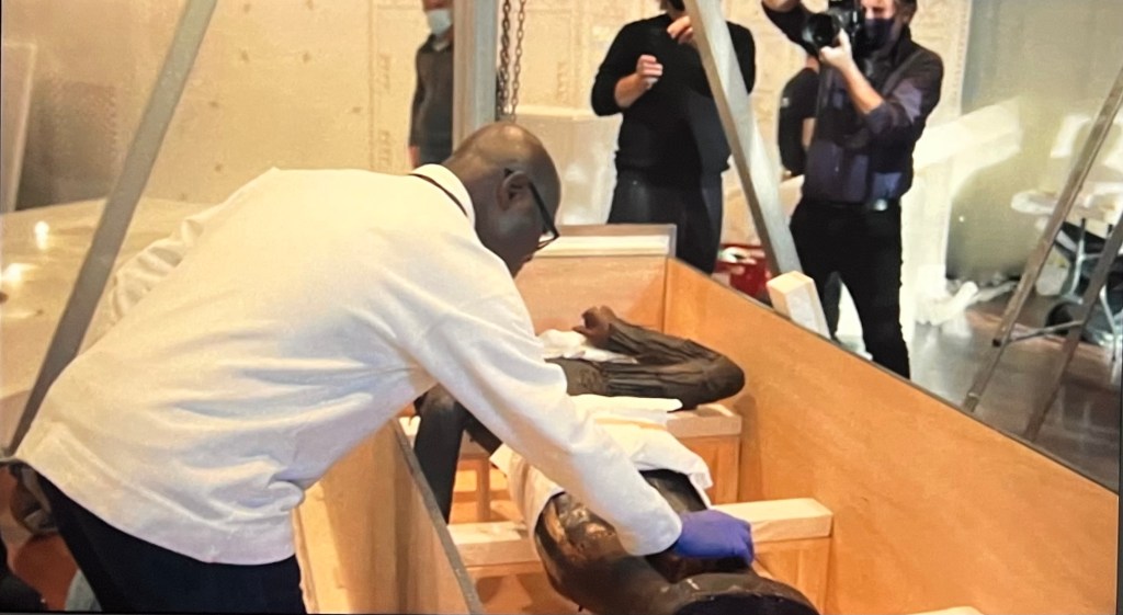 When the crates finally arrive in Benin, the tone shifts. Warm light, handheld camerawork, and the sounds of drums and crowds replace the cold, fluorescent-lit storage rooms. The artifacts are not behind glass; they are received in public, and returned to the homeland. This contrast makes a powerful argument: objects belong not in sterile silence but in living cultural space.