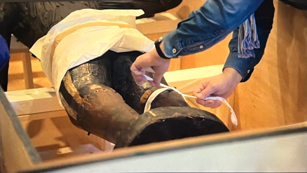 Crates, storage boxes, and shipping containers are shown in long, patient shots, their repetition recalling rows of coffins. This makes the viewer think of how artifacts, like human bodies, are trapped, preserved, and yet deprived of life. The boxes reminded me of Squid Game a show, where each eliminated body (dead body) is sealed in a coffin-like container here, each artefact is sealed in wood and glass, removed from ritual use and taken away from its homeland.