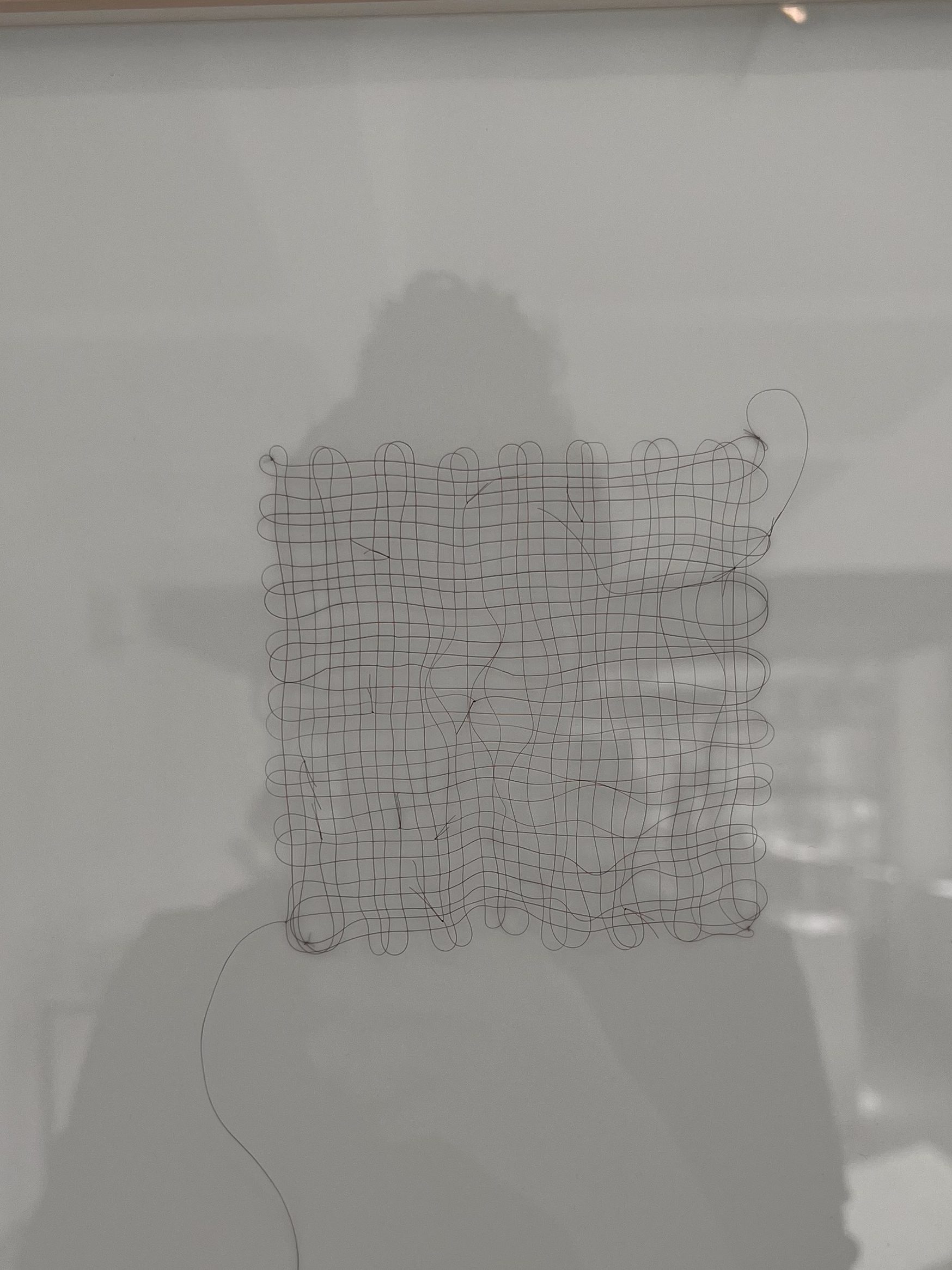 All three works deal with the grid, but they approach it in very different ways. Mirror is made of rigid steel bars and looks more like a cage than a mirror. Instead of reflecting the viewer, it blocks you, making you think about barriers and limitations. The hair grids are much more fragile and personal. Each strand of hair has been knotted and woven together, which immediately brings in the presence of the body. Hair is intimate, living material, and by turning it into a grid, Hatoum changes something usually impersonal into something organic and human.
